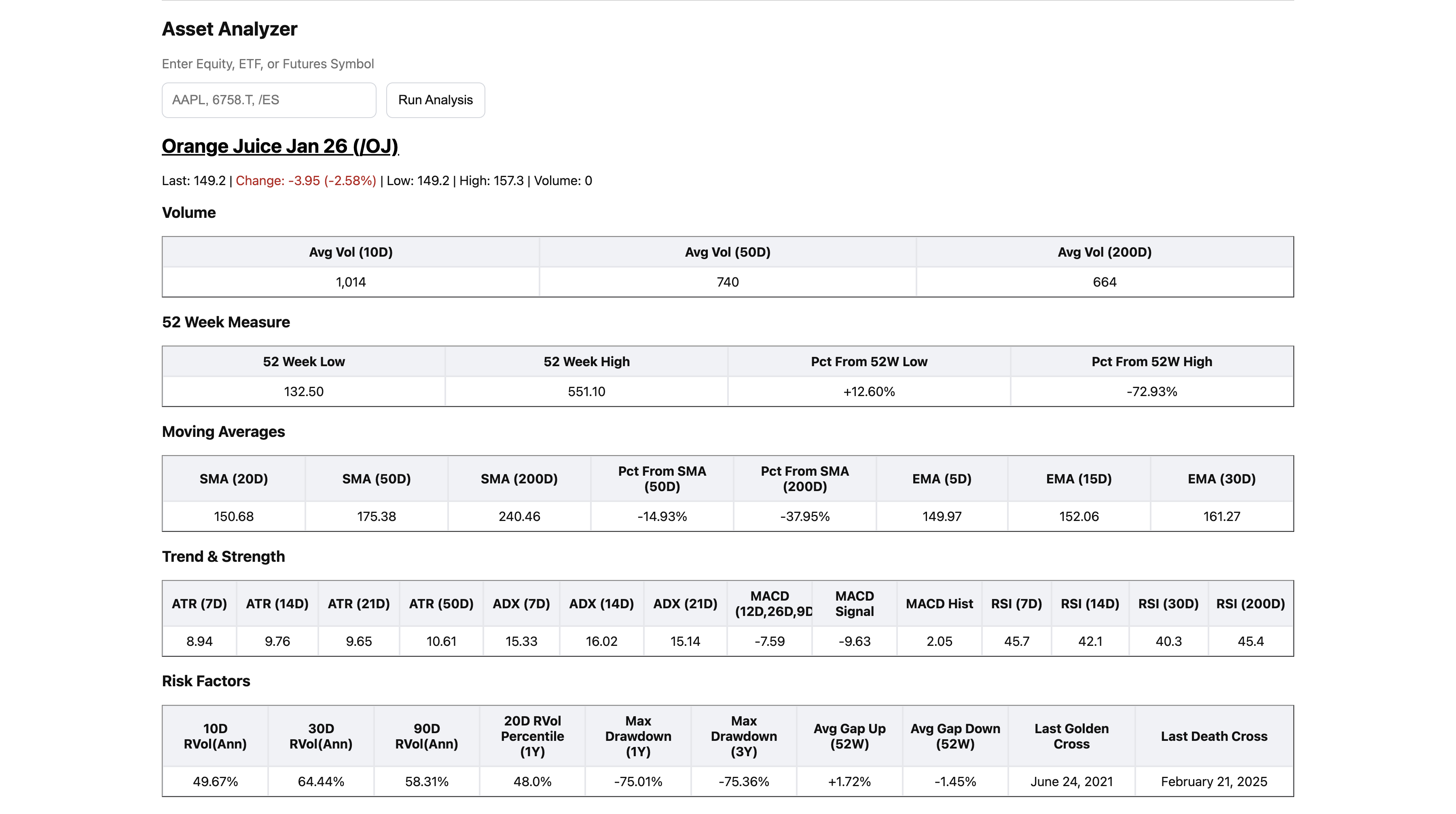 On-demand technical and risk profile for any symbol—covering trend structure, volatility and drawdowns, long-run performance metrics, and forward price distributions via Monte Carlo simulations.