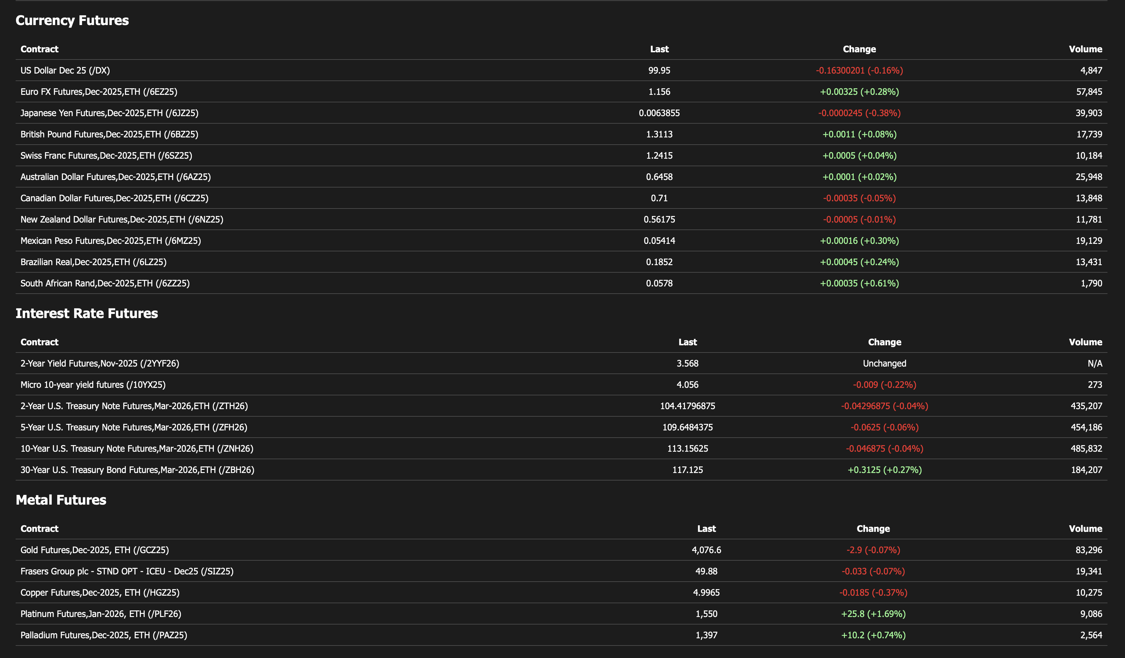 Ranked view of your key futures and equities showing price, percent change, and volume—so you instantly see where participation, momentum, and liquidity are concentrating.