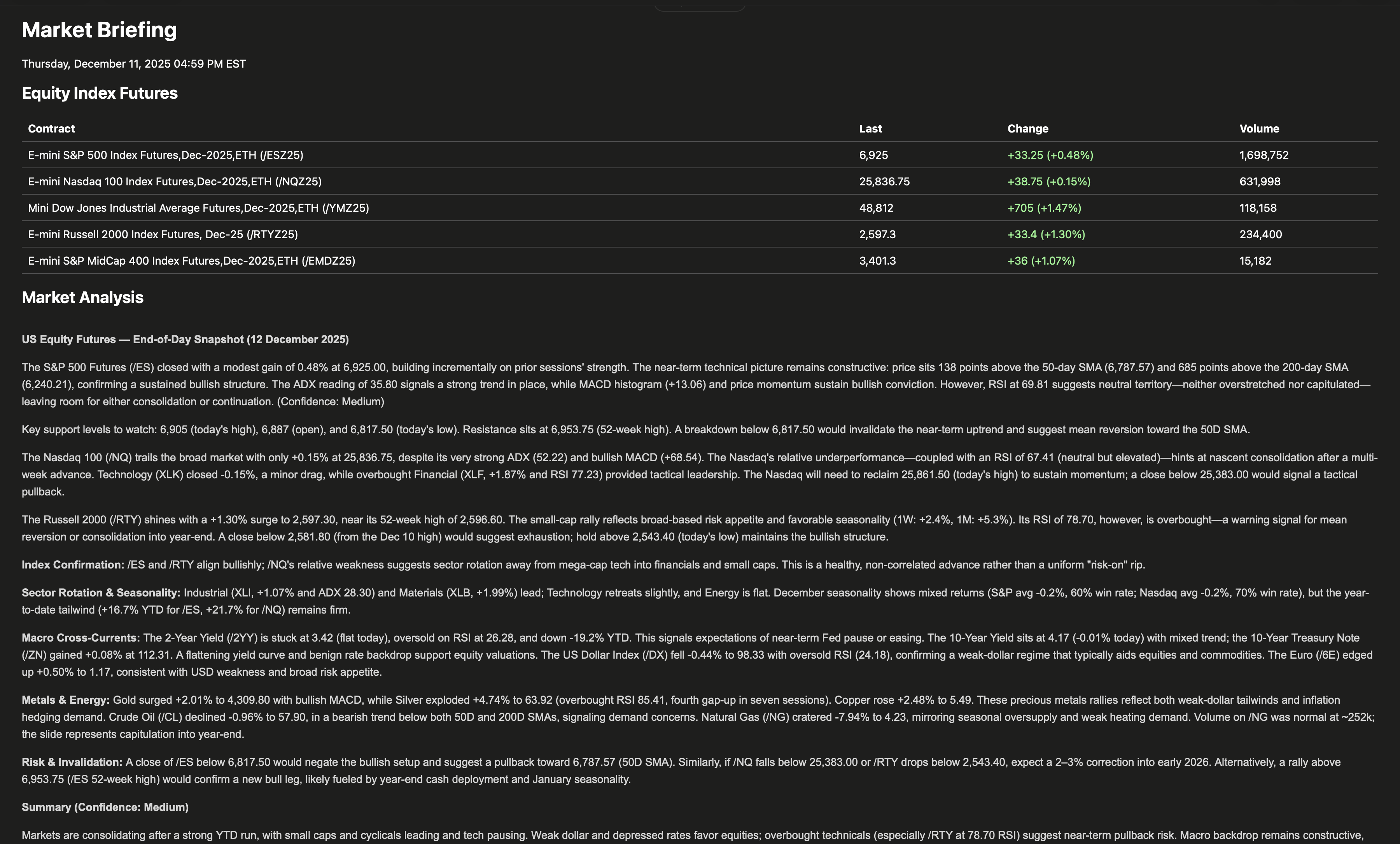 Receive market briefings, options reports, trading snapshots, and watchlist diagnostics at key session times—capturing the open, midday shifts, and the close without constant monitoring.